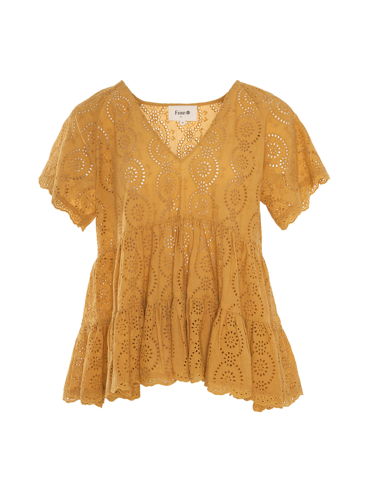 Super fin Svale bluse fra Fine cph. Blusen er gul med super flot hullet mønster. Den har små flæsedetaljer og en v-halset udskæring. Style den med et par jeans eller en smart nederdel.Om produktet
