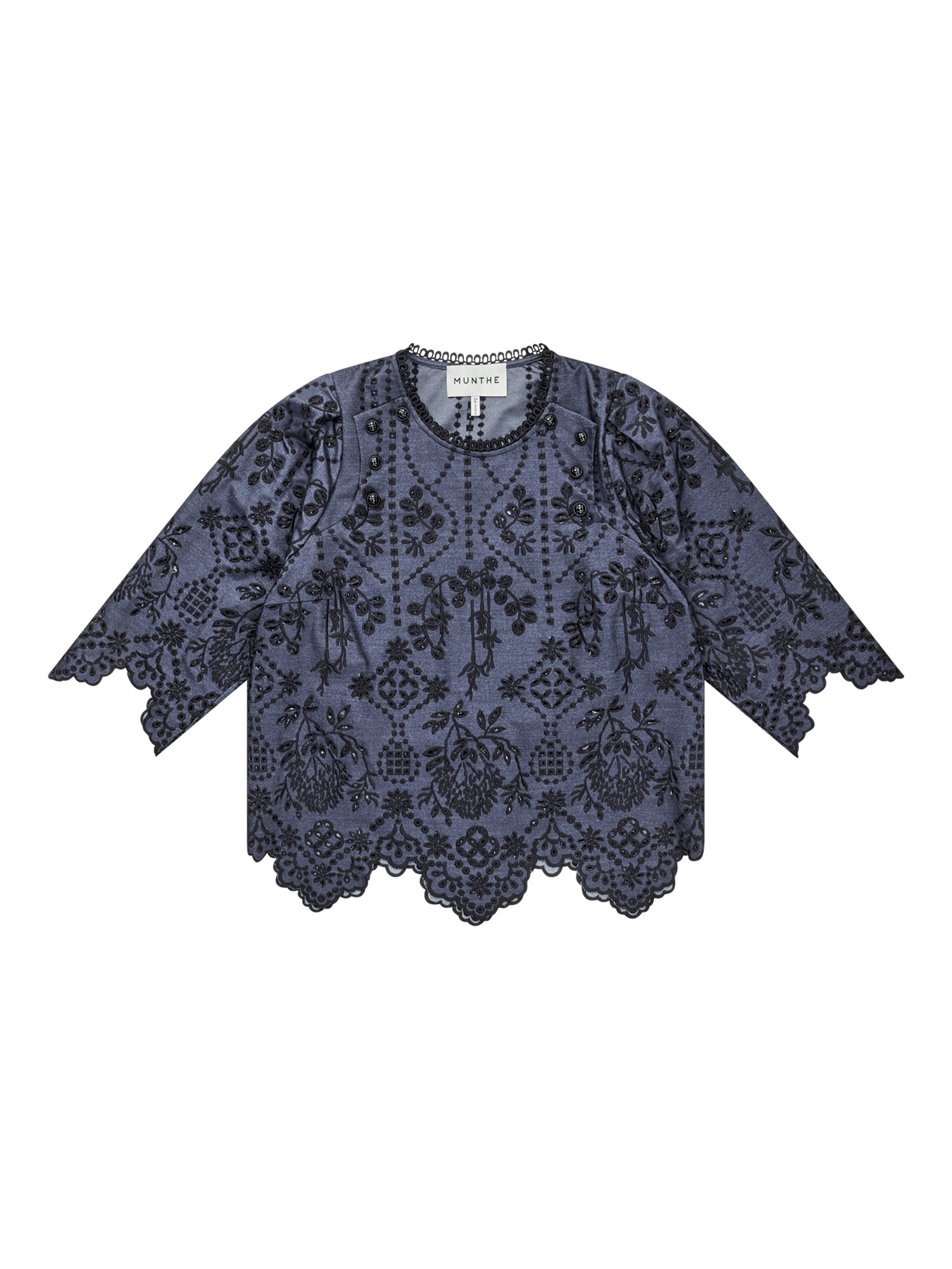 Bluse med et smukt all-over broderi og en elegant detaljeret krave, ærmer og kant nederst. Blusen er lavet af 100% økologisk bomuld og har rund hals med en elegant knaplukning i nakken.Om produktet