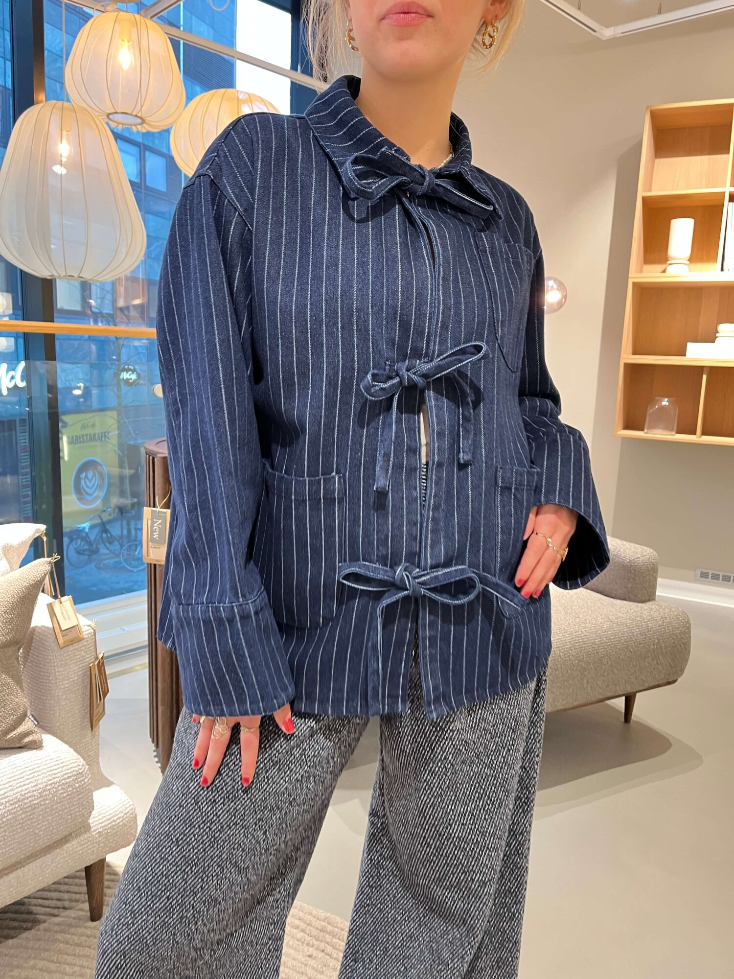 Cool denim skjorte en lækker bomulds kvalitet med striber. Pasformen er løs og boxy. Skjorten har bredde ærmer og bindebånds lukning ned foran.Om produktet