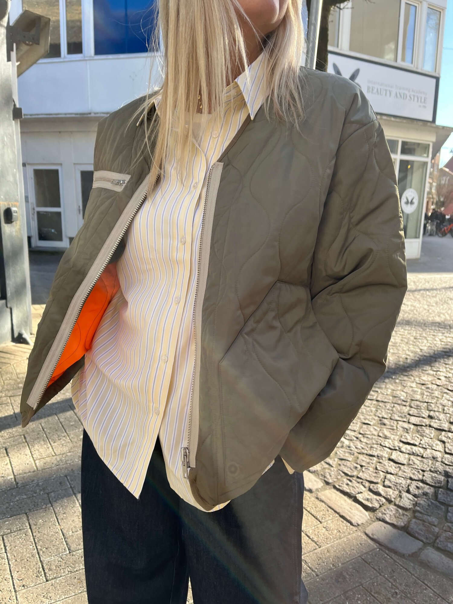 Poly Twill Alice er en boxy, kviltet og oversized jakke med V-skæring, orange foer og lynlåsene syet udvendigt på.Om produktet