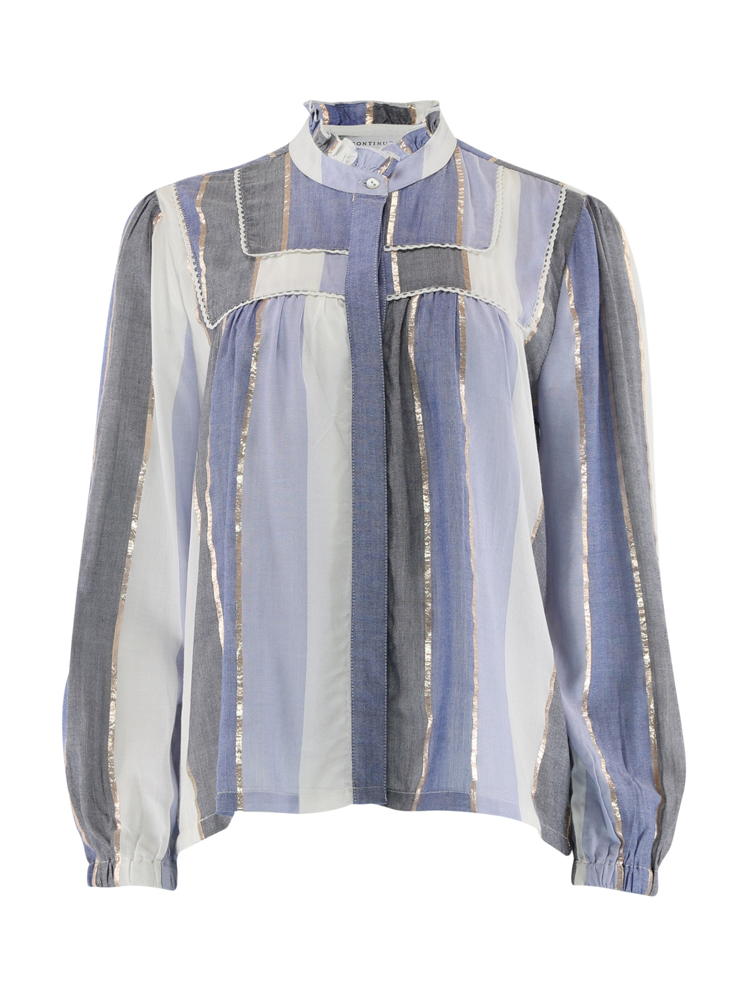En elegant bluse fra Continue i en flot blå farve med metalliske lodrette guld striber.Om produktet