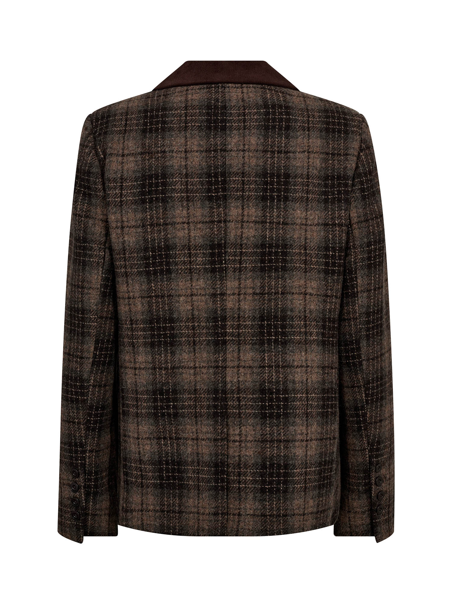 Denne klassiske blazer er skåret i et flatterende, regulært fit og vævet i et ternet mønster med diskret struktur. Fløjskraven tilfører et luksuriøst præg og løfter det tidløse design med et moderne twist. Blazeren er detaljeret med klaplommer, enkel knaplukning og glat for, der gør den nem at style i lag. Brug den sammen med jeans for et afslappet look eller med skræddersyede bukser for et mere sofistikeret sæt.Om produktet