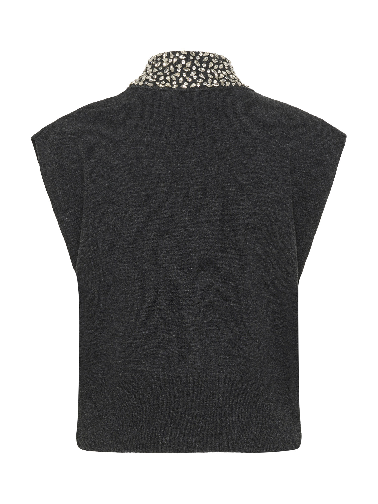 Ærmeløs strik med høj hals, dekoreret med funklende rhinsten. Et elegant design, der kombinerer minimalisme med iøjnefaldende detalje.Om produktet