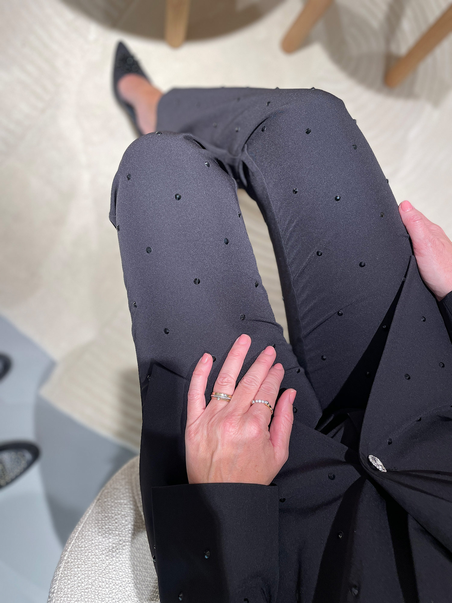 Seje habitbukser med rhinsten "print" og paspellomme bagpå.Køb den matchende blazer for et cool look.Tanja er 174cm høj og har størrelse 38 på.Om produktet