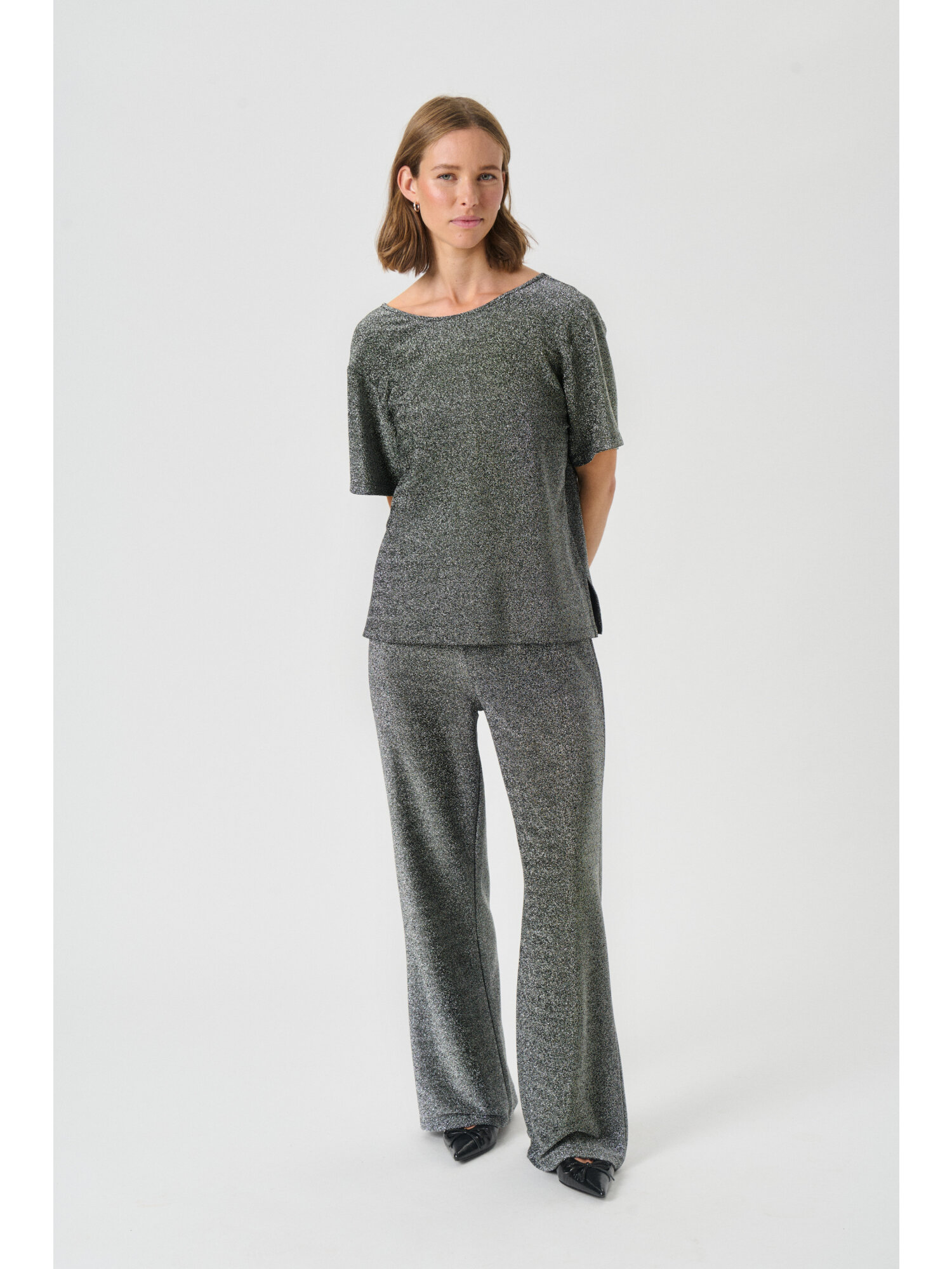 - 53% Polyester (Recycled),28% Viscose,15% Metallic Yarn,4% Elastane