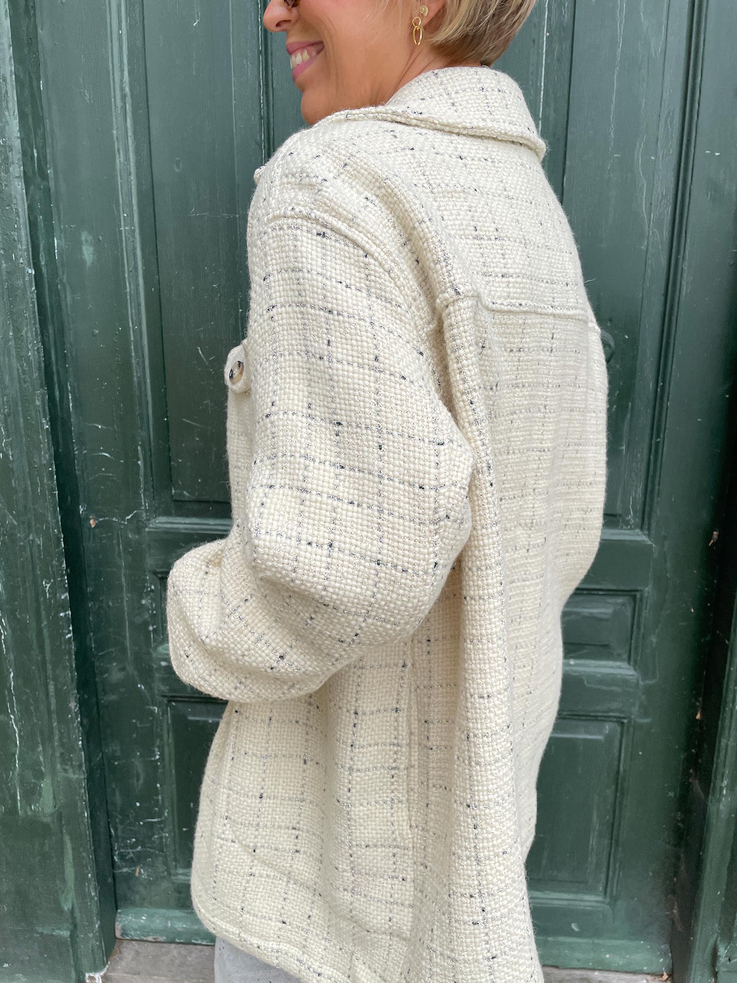Denne elegante og stilfulde jakke, som vil tilføre ethvert outfit et tvist. Skjortejakken er med en afslappet pasform, og kan bruges både som jakke, men også som mellemlag. Skjortejakken har to lommer foran, og en knaplukning.Tanja er 174 cm høj og har sin normale str. 38 på.Om produktet